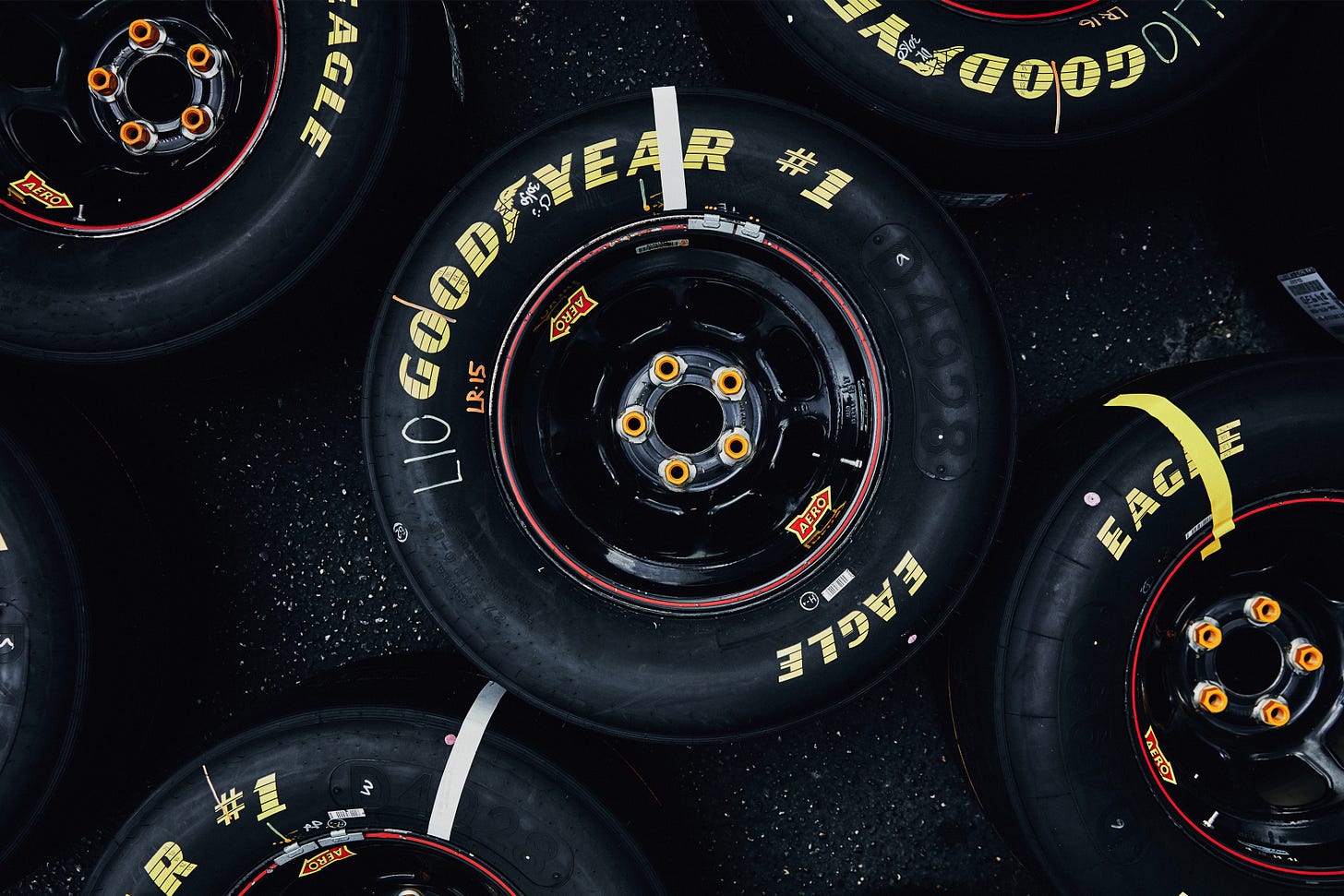 The tire carrier pulls the melted tire from the car and rolls it aside for another crew member to handle. A fresh wheel wrapped in brand new Goodyear rubber is lifted onto the car’s hub. The tire changer smashes the little button on their impact gun, changing its setting immediately from loosen to tighten.