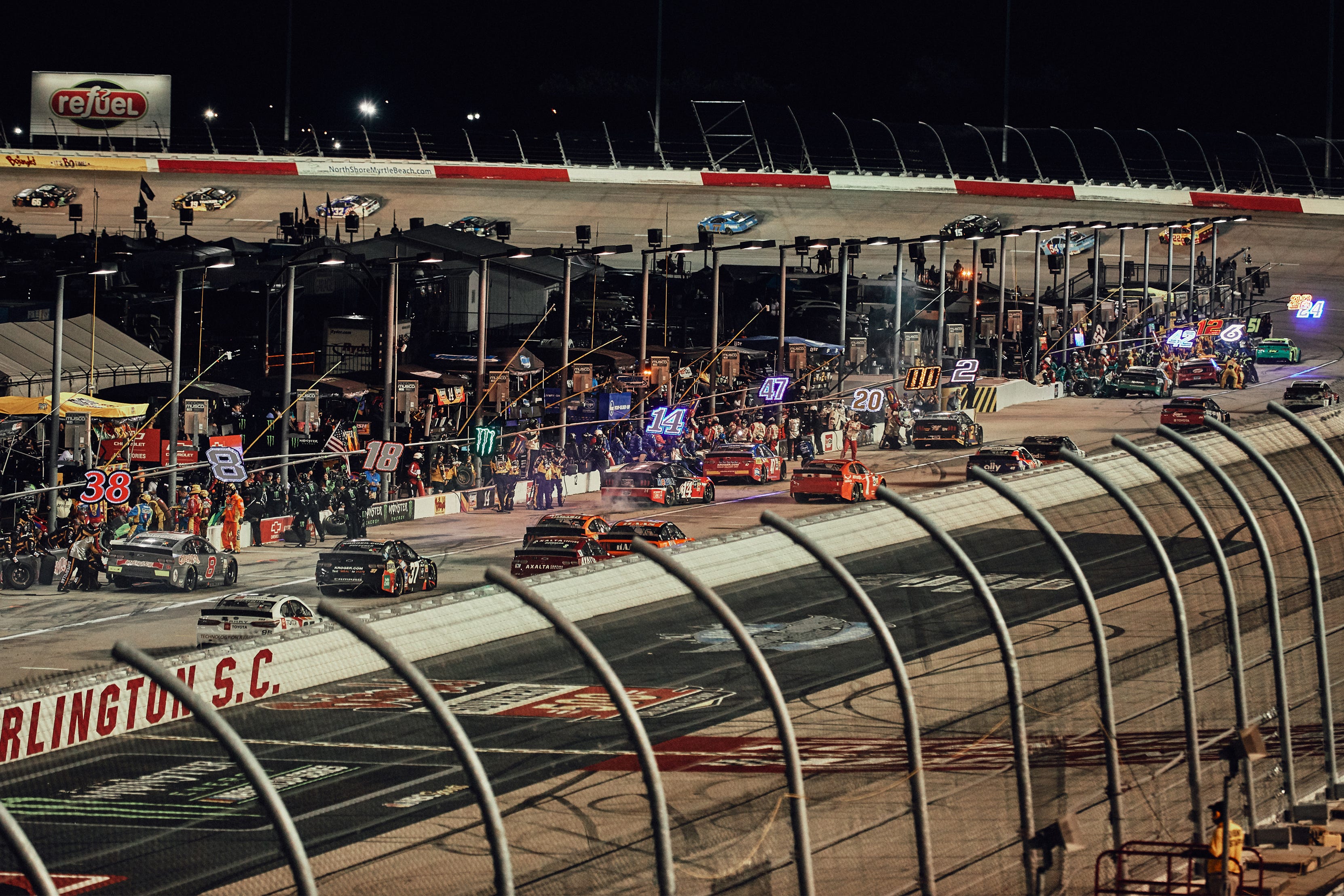 Thirty-nine race cars rumble down pit road, their 358-cubic-inch small blocks shaking the very ground beneath them as 47,000 fans rise to their feet. They have packed into Darlington Raceway’s grandstand on a sweltering late-August South Carolina night for The Southern 500, one of NASCAR’s crown jewel races, and are all angling for a better view of one of stock car racing’s most exciting moments: the pit stop.