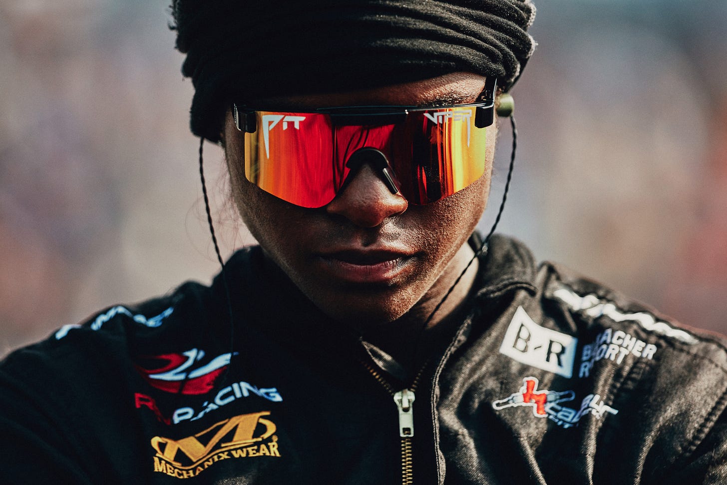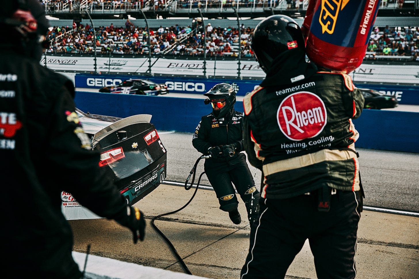 The 54 car inches closer to its pit stall, and the crew members’ stances tense as they take their places atop the low pit wall. Jacks and fuel cans are heaved on massive shoulders. Brehanna Daniels grips her trusted impact gun and coils her body tight, ready for the dance she’s practiced a million times before.
